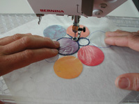 Cover tear-away with „Solvy“ Attach freehand embroidery foot, select zig-zag. Connect all the circles by sewing around them .