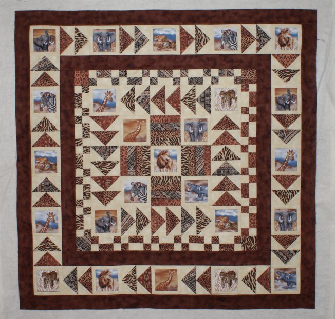 Africa has always been a great source of inspiration for textile designers throughout the world. The rich variety of wildlife and flora as well as the striking combinations of colour and bold designs created by the African people, lend an exotic edge to ones imagination. In this range, which we have called Wild Things, we have used 3 patterns taken from the shapes and textures to be found in animal prints and teamed them with another pattern inspired by African design. This last pattern shows the bold effect created by the use of resist dyes and stencils, which were often cut from bark, leaves or other natural fibres and these techniques were used by many different tribes and areas in Africa. Along side these we have added contrast with a textured plain, taken from our misty range of fabrics, and a popular panel featuring 4 different images of African animals, an elephant, giraffe, zebra and lion. 3 different colourways have been used to tone in with the natural colours to be found in the African landscape quilt instructions dowload