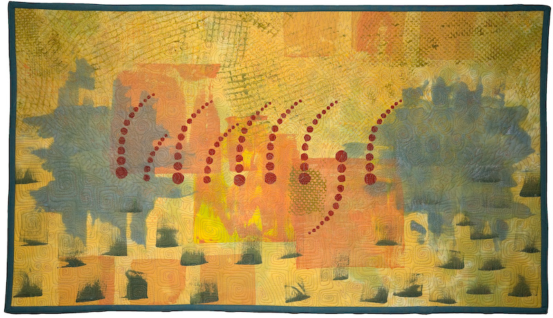 I usually start a new work by dying my fabric in a rather free way, and then look to what the fabric tells me. As I go on, I put on other fabrics and materials, or I sew together a patch, to be the topping of the quilt. Quite often I transfer photo on to silk printing frames, and repeat the theme in different angels and shades.