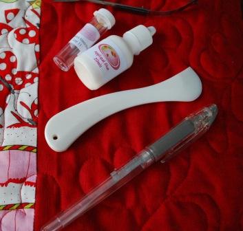 Probably my applique gear. I have a bit of a different method of needleturn applique that makes it so much easier. I use a silver gel pen, liquid applique glue and very fine needles. Theres a kit of all the “bits” available on my website if you want to give it a go!