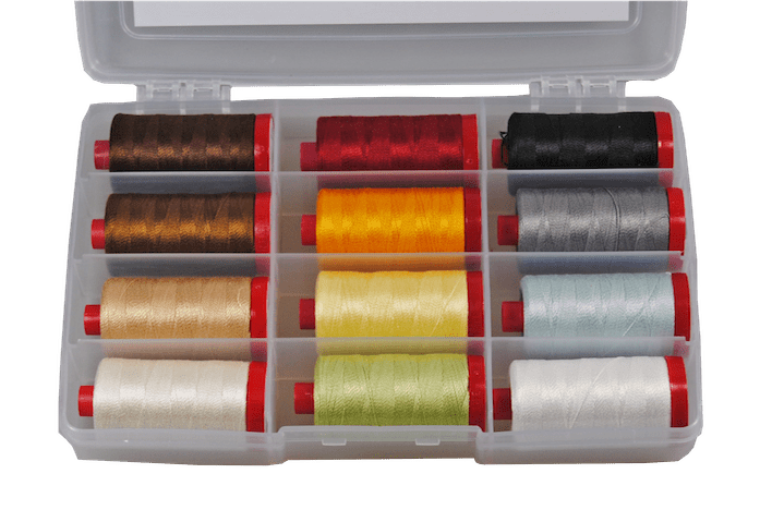 The first collection case includes 12 colors of 12 wt thread in large spools each containing 386 yards .