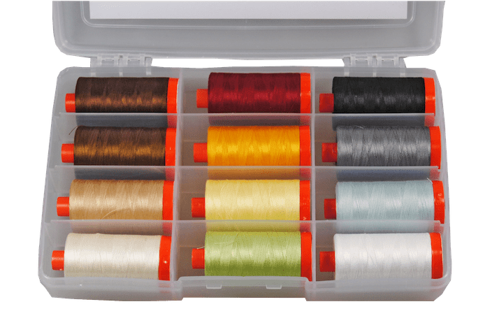 Aurifil is presenting two thread collections to accompany her fabric. Each collection has 12 spools of the finest cotton.