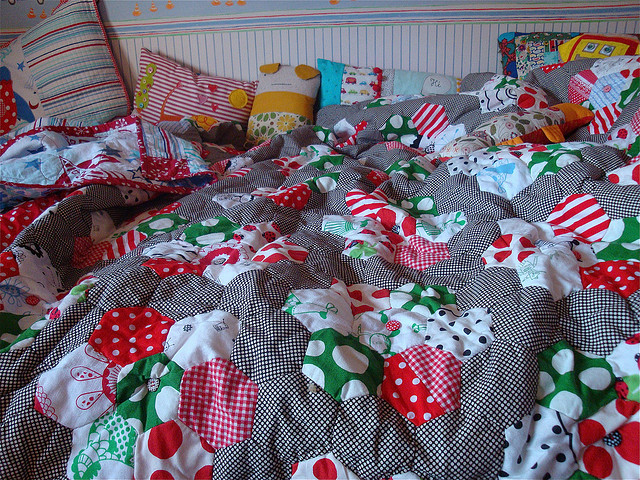 The first patchwork I did was English Paper piecing way back when I was small. I don’t think it ever made it further than a few hexagons sewn together, and I don’t have it any more, sadly.  I have the first quilt I finished though! Although it wasn’t my first finish, it was my first start. It took me forever to finish it and it lived without binding for the longest time. My little boy has it on his bed at my parent’s house, and I still love it. So does he.