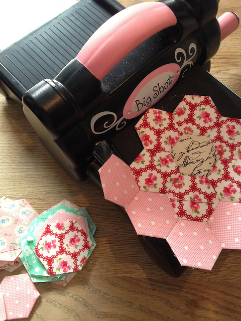 I love to use a SIZZIX Big Shot Machine, not for everything, but especially for cutting out squares from my scraps or strips and also hexagons. I use my SIZZIX Big Shot for cutting both the papers and the fabrics – I use the smaller size die for the hexagon papers and the larger ones for the fabric. It has saved me so much time and means I don’t end up with that claw hand that you  get from using scissors for too long.