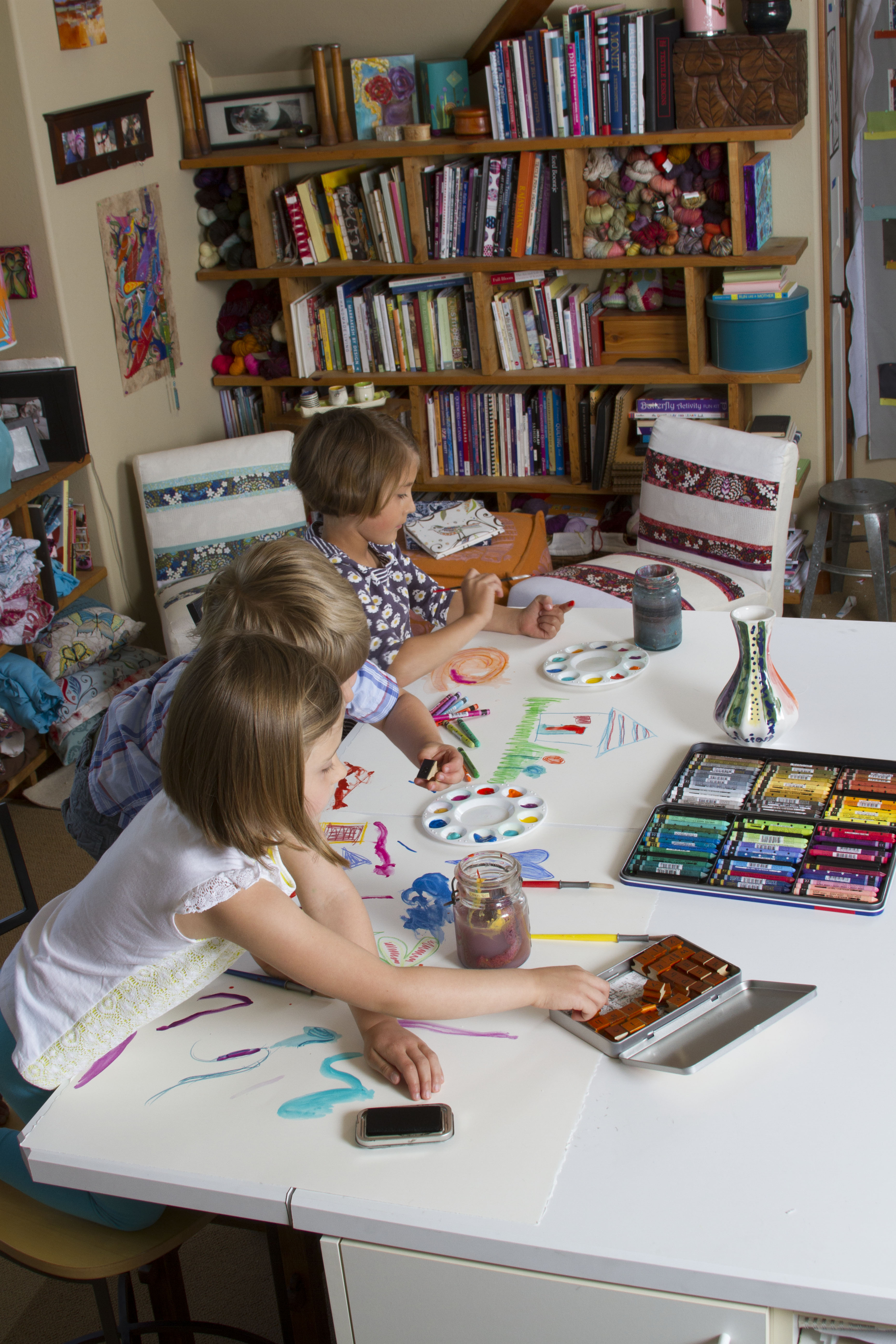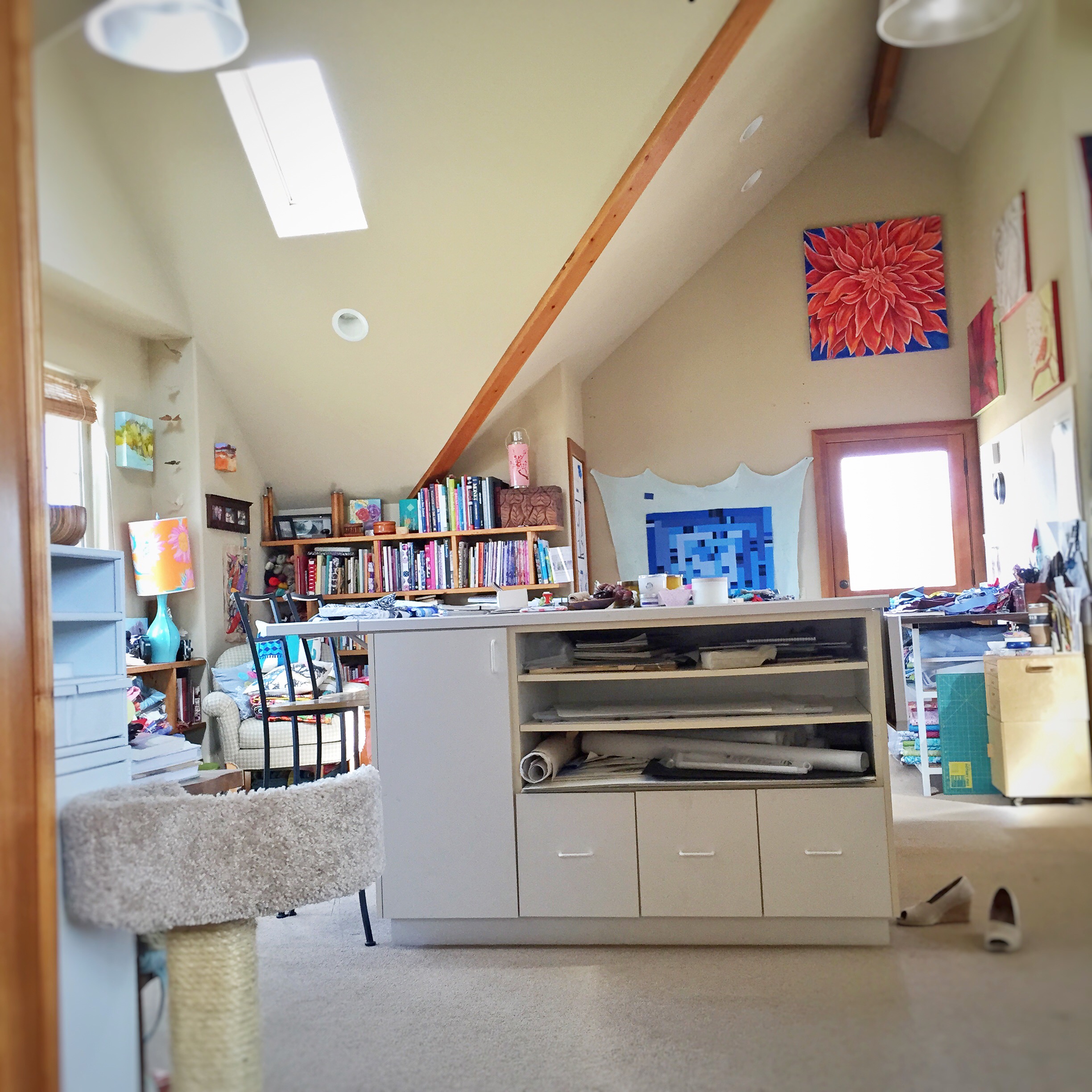 My studio is above our two car garage and attached to the house, with vaulted ceilings and sky lights it is rare for me to use lights during the day.