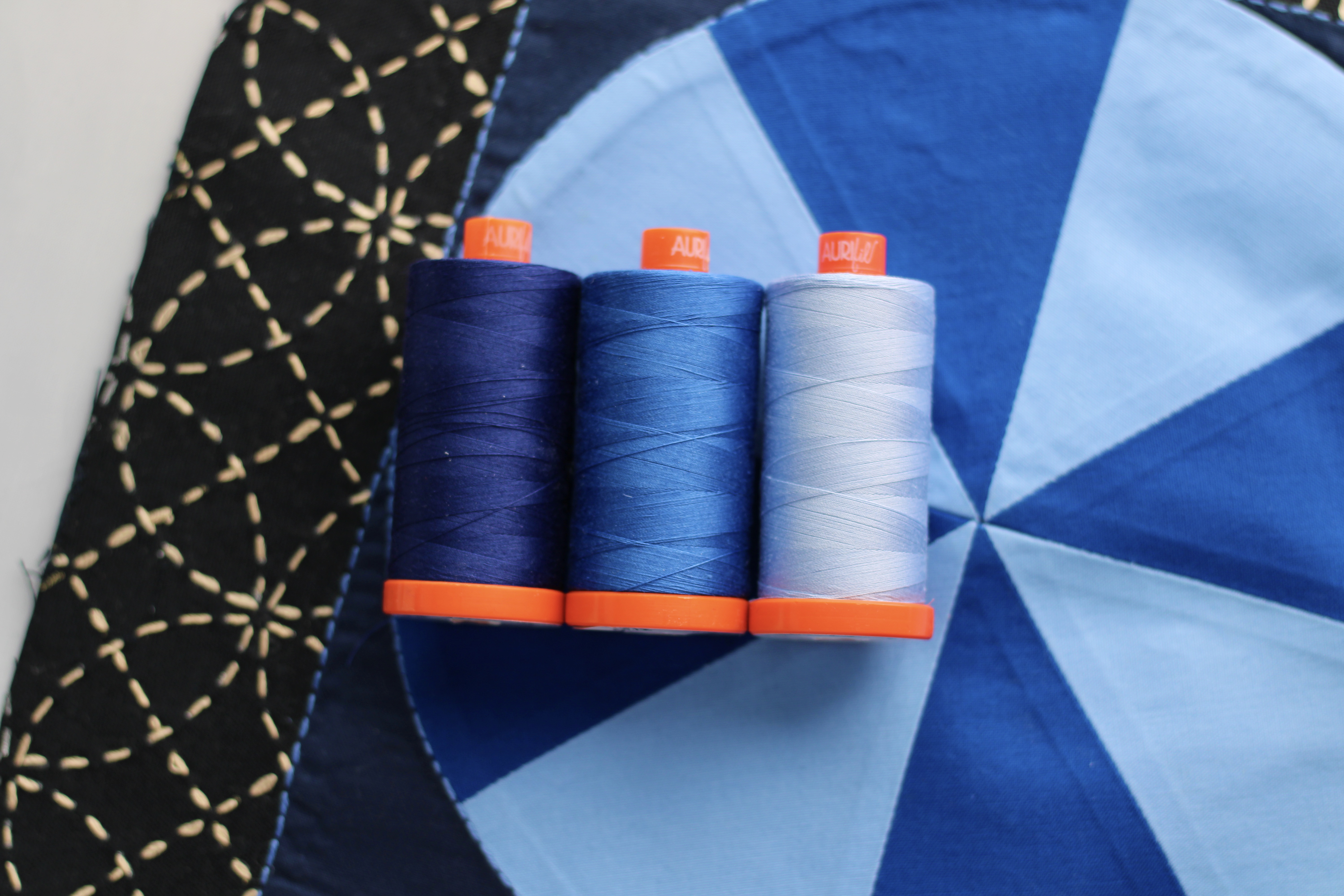 Inspired by the shapes of the stain glass windows found in the Como Cathedral dedicated to the Blessed Virgin Mary which was constructed in the 14th century. The center of the block is divided into 4 squares blocks. Each individual block pie shape is created with two of the como blue colors from the aruifil como blue thread builder set. From there I used the remaining como blue color from the como blue thread builder set. The final block is made up of Sashiko pattern fabric and handstitched. As if you are looking into the water of the lake as the lake bottom becomes deeper the watercolor also changes.