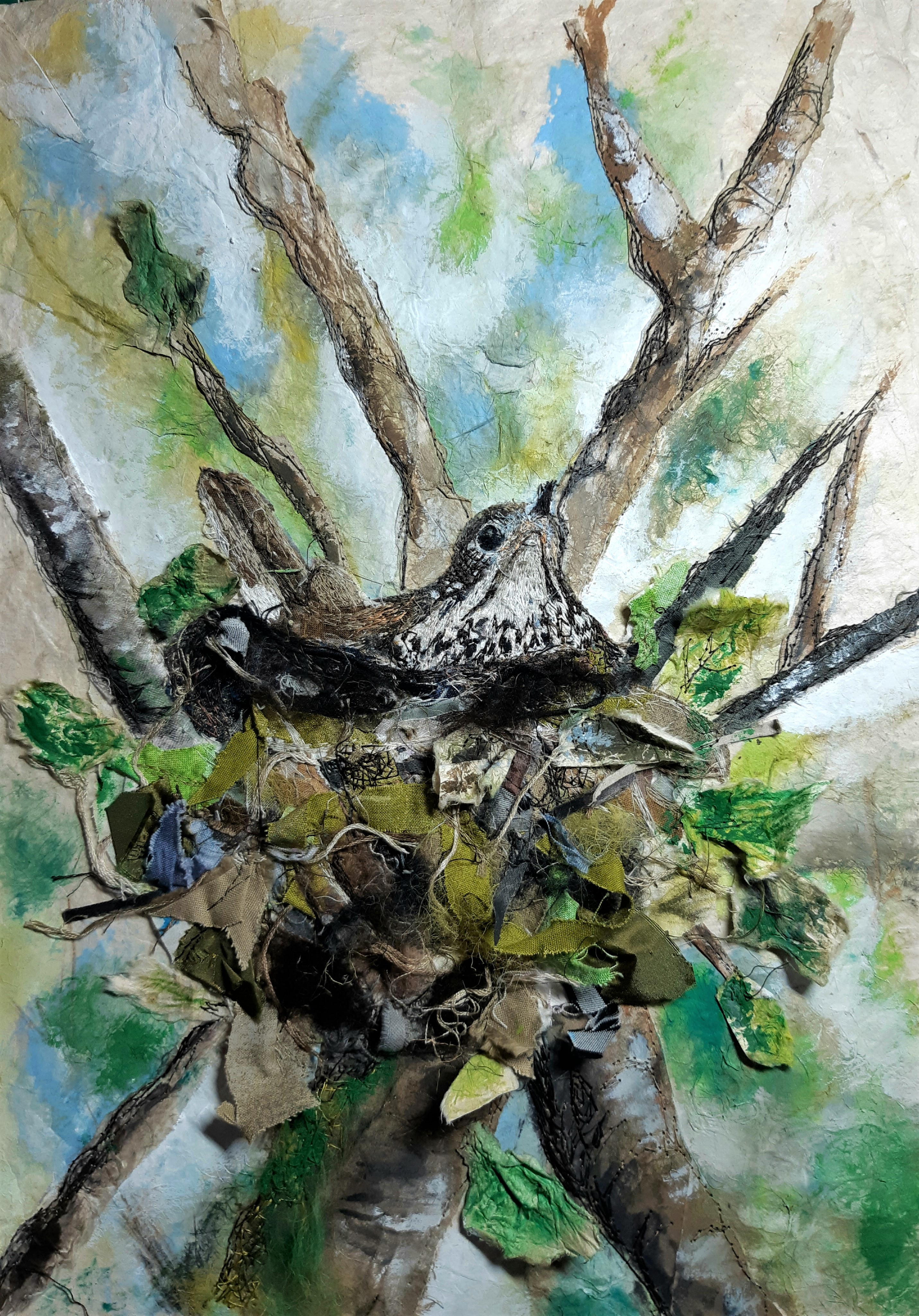 Alison Holt – “Inspired by an Autumnal woodland scene I used a large range of the Mako 50 to stitch the texture of leaves. This tells the story and shoes all the stages of colour selection, silk painting the background and layering stitches”