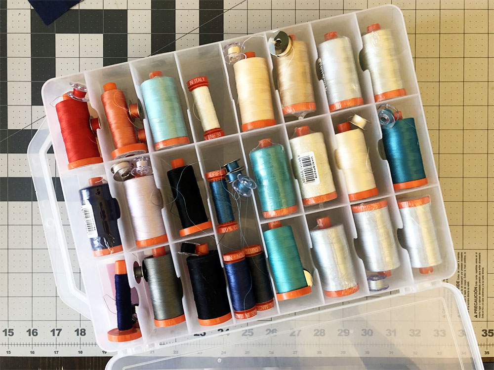 Sarah Ruiz – “After experimenting with several different thread storage options over the years, I’m sharing the easy and efficient method that I finally landed on that works for me! These nifty boxes let me store spools and bobbin together, prevent lesser-used threads from gathering dust, and hold a lot of thread in a relatively small space.”