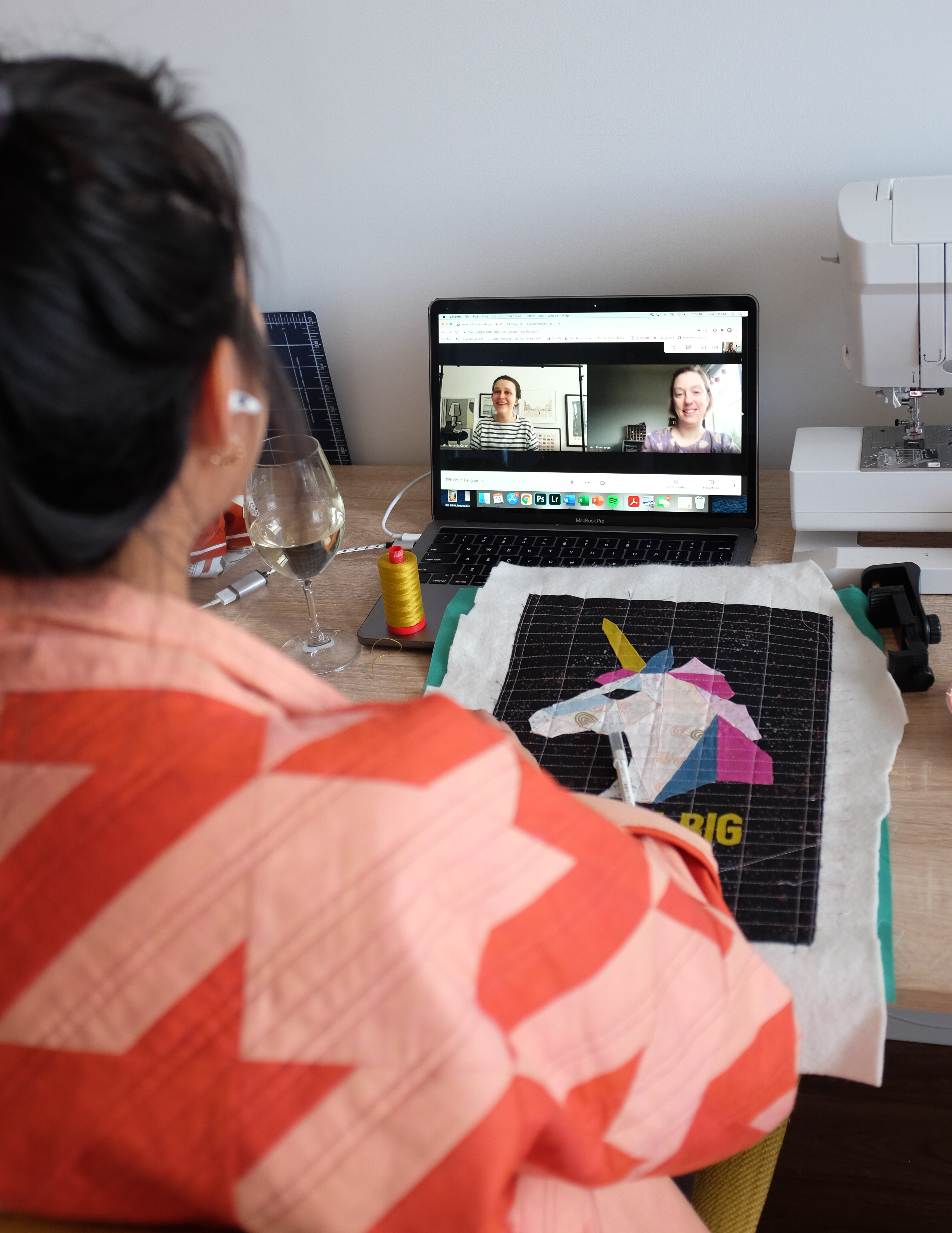 Since this was our first time hosting a virtual hangout and we wanted to see how conversation flowed, we eventually settled on having a small group of three (including us). Since we were both planning on working on our Aurifil Artisan March EPP project challenge, we thought it would be fun to invite our fellow Artisan (and EPP-er extraordinaire), Laurel of @porcupinesews_threads.