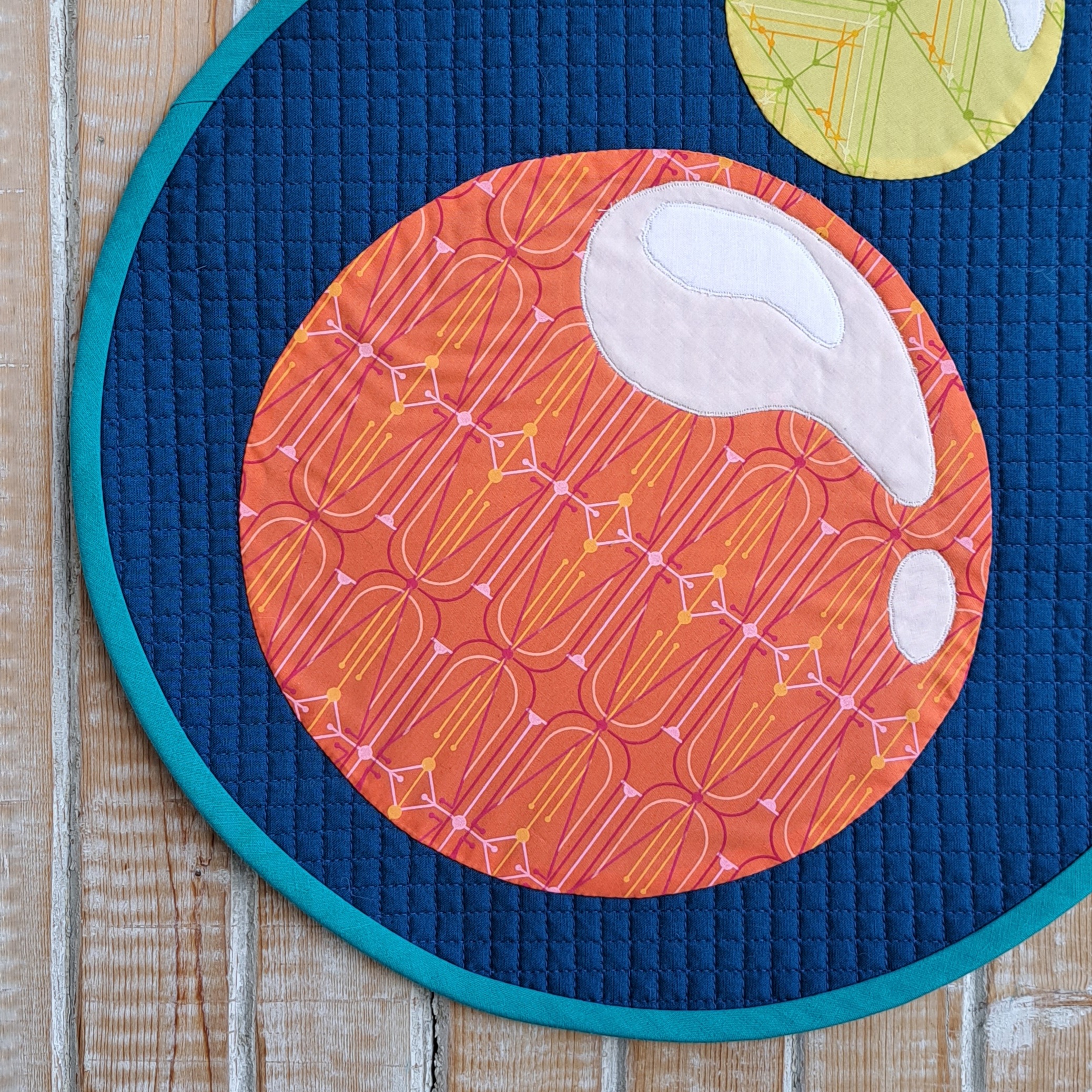 I’ve started to think outside the quilt rectangle and explore what lies beyond… This playful wall quilt is shaped by the appliquéd bubbles within its frame.